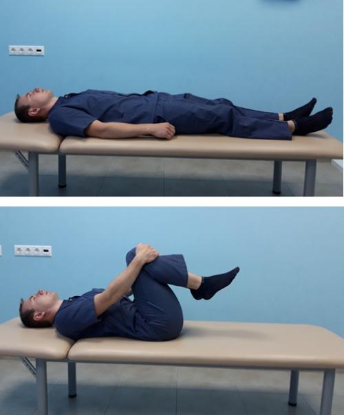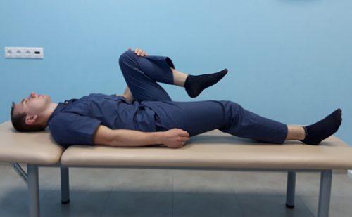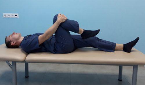 Переходим к выполнению комплекса ЛФК для поясничного отдела позвоночника третье ступени. Ложимся на спину, руки вдоль туловища. По очереди каждую ногу сгибаем 2-4 раза в коленном и тазобедренном суставах, бедро прижимаем к животу.