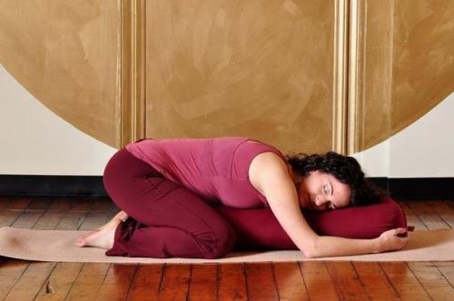 2. сесть на пятки, зажать коленями подушку и обнять её руками. Сделать 10-20 глубоких вдохов и выдохов, повернув голову налево. Затем выполните это упражнение в другую сторону.