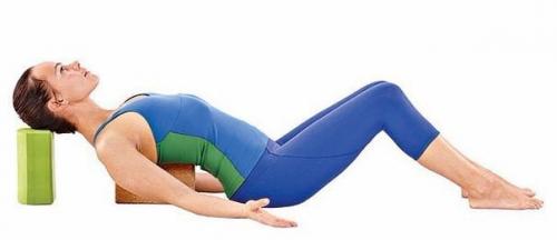 Положите голову на высокую грань кирпича. Верхнюю и среднюю часть спины поместите на горизонтально лежащий кирпич. Согните ноги в коленях и опустите подошвы стоп на пол. Расслабьте Лопатки и полежите в течение 1-3 минут.