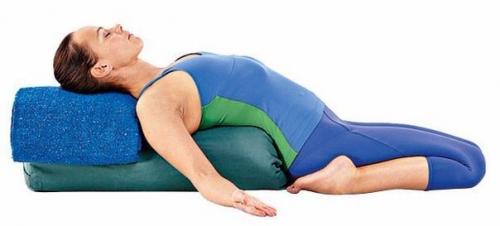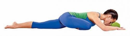 Опуститесь на пол, раздвинув пятки (валик находится за вами. Затем лягте на него, опустив голову на одеяло. Задержитесь в позе на 1-3 минуты.