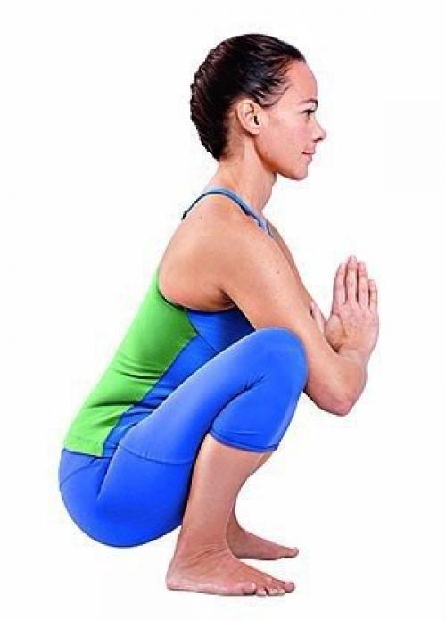 Ноги на ширину плеч поставьте. Согните колени и опуститесь на корточки. Удерживайте равновесие между пятками и подушечками пальцев ног. Соедините ладони у груди, прижимайте локти к внутренним коленям.