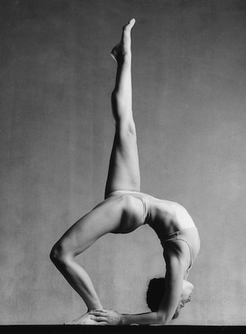 - Оторвите пятки от пола и встаньте на кончики пальцев ног для того, чтобы еще больше прогнуть позвоночник, сократить мышцы ягодиц и вытянуть органы брюшной полости. Теперь все тело будет в форме хорошей арки. Не опуская туловища, вытяните лодыжки и поставьте пятки на пол.