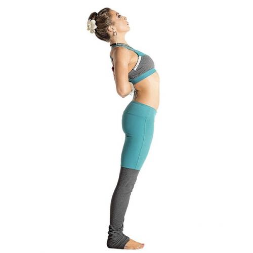 Тадасана. Размещаем ладони вместе, пальцами вверх за спиной в намасте (если вверх пальцами не получается, то пальцами вниз. Отталкиваясь ногами от пола, а ладонями - друг от друга, создаём вытяжение вверх и уходим в мягкий прогиб, отслеживая, чтобы копчик был слегка подкручен и вы всё время вытягивались вверх, раскрывая грудную клетку.
