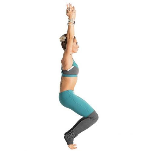 Уткатасана. Стопы на ширине таза. Поднимаем руки вверх на ширине плеч. Поднимая пятки вверх, приседаем, подкручивая копчик, и садимся вниз до точки предельного напряжения (но не опускаем таз ниже колен), удерживая спину абсолютно прямой. Создаём непрерывное вытяжение позвоночника в обе стороны: за руками вверх и за ногами - вниз.