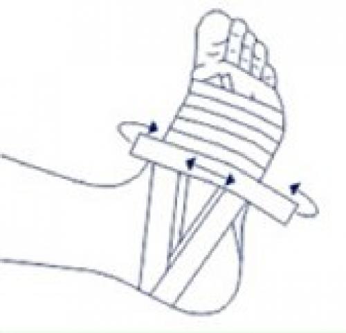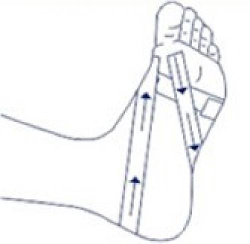 На подошву наклейте несколько поперечных полосок пластыря с натяжением. Края закрепите на полосе, которая проходит по краю стопы.