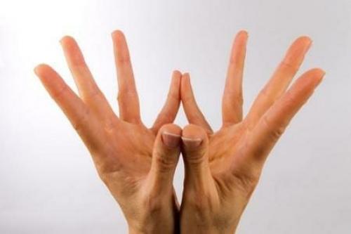 Эта практика позволяет улучшить психоэмоциональное состояние. Попросту соедини безымянные и большие пальцы на каждой руке по отдельности. Причем выполнять упражнение следует на обеих руках одновременно. Незадействованные пальцы следует держать выпрямленными. Эту мудру используют для прекращения истерики или в моменты сильного стресса.