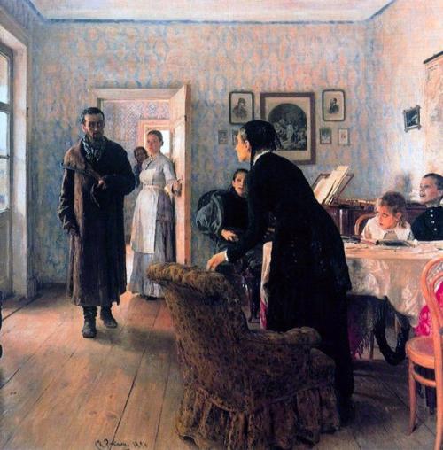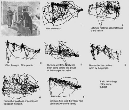 В одном из опытов ярбус предлагал испытуемым рассматривать картину Репина "Не Ждали" с разных "установок", то есть стараясь решить ту или иную логическую задачу. И что же? Когда было необходимо оценить материальное положение семьи, особое внимание взора привлекало убранство комнаты, которое при "Свободном" рассматривании практически не замечалось. Пытаясь вычислить возраст персонажей, зритель направлял зрачки исключительно на лица. Быстрые перелеты от лиц детей к лицу матери и далее к лицу вошедшего (и немедля обратно, и снова назад по тому же пути) - таково решение задачи "сколько времени отсутствовал тот, кого не ждали? Беспорядочно блуждающий взгляд - попытка запомнить расположение людей и предметов в комнате.