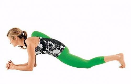 Из собаки мордой вниз, сделайте шаг правой ногой к внешней стороне правой ладони. Опустите левое колено на пол и поместите на пол предплечья. Удерживайте позу на протяжении 5-10 дыханий. Перейдите в собаку мордой вниз. Повторите на другую сторону.