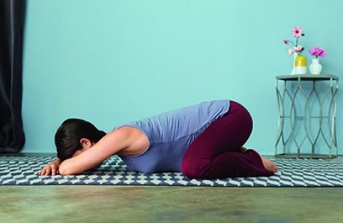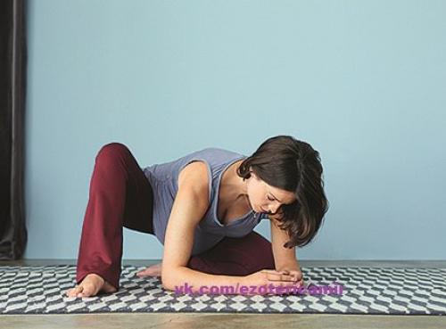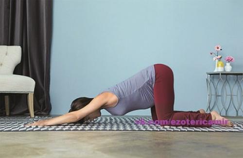 Поза щенка - "Близкий Родственник" адхо мукха шванасаны (поза собаки мордой вниз. Войдите в позу, опираясь коленями и ладонями в пол. Таким образом, если необходимо, поставьте колени несколько шире, чем бедра. Прижмите голени к полу и пройдитесь руками вперед до тех пор, пока лоб не сможет опуститься на пол. Плотно прижмите ладони к полу, сохраняя плечевые кости поднятыми. Как только вы найдете удобное положение, втяните ребра к позвоночнику и немного опустите копчик. Эти действия помогут вам почувствовать вытяжение в позвоночнике. Следите за тем, чтобы живот не опускался на пол. Задержитесь в позе на пять циклов глубокого дыхания.