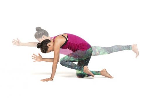 Марджариасана/битиласана (вариация. Оставаясь на четвереньках, слегка подтяните пупок к позвоночнику, чтобы задействовать абдоминальные мышцы. На вдохе вытяните правую руку вперёд, а левую ногу отведите прямо назад, выворачивая внутреннюю поверхность левого бедра вверх к потолку. На выдохе дотроньтесь правым локтем до левого колена, округляя спину и подгибая подбородок к груди. На вдохе выпрямите руку вперёд, а ногу отведите назад. 4-5 Раз с каждой стороны выполните.
