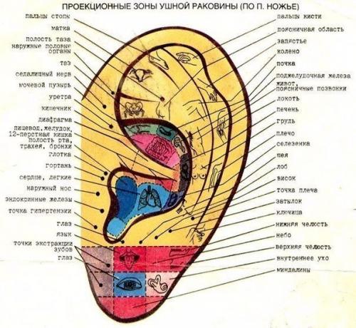 Как вы заметили, контур уха очень похож на ребенка в животе беременной женщины, так же головка вниз, ножки наверх. Вот и активные точки на ушной раковине расположены таким образом, что проекции органов головы ( глаза, уши, горло, лоб, челюсти и др. ) Сосредоточены в области мочки, а конечности ближе к верхнему краю уха. Козелок и прилегающая к нему территория - внутренние органы.