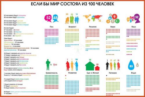 Лишь в том случае, если бы на всей земле жили только 100 человек, то 57 из них были бы выходцами из Азии, 21 - из Европы, 14 - со всего американского континента и 8 - из Африки. 52 были бы женщинами, 48 - мужчинами, 30 - белыми, 70 принадлежали бы к другим расам. Христианами были бы 30 жителей, мусульманами - 23, 47 исповедовали бы иные религии. Гетеросексуалами были бы 89 человек, 11 гомосексуалистами. 6. Человек владели бы 59% всех ее богатств, и все они были бы североамериканцами