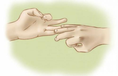 Теперь соединяем подушечки пальцев: мизинец правой руки с безымянным пальцем левой, а безымянный палец правой руки с мизинцем левой. В итоге средний палец каждой руки должен оставаться свободным и расслабленным.