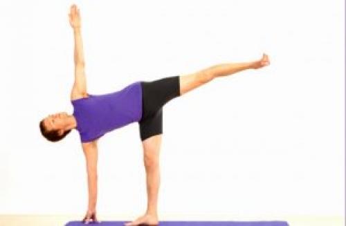 - Поднять медленно вверх левую ногу, разворачивая корпус вбок. Убрать руку с пояса и вытянуть ее вверх. Левая нога должна составлять с туловищем единую линию. Руки также нужно держать на одной вертикали.