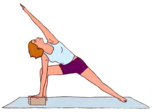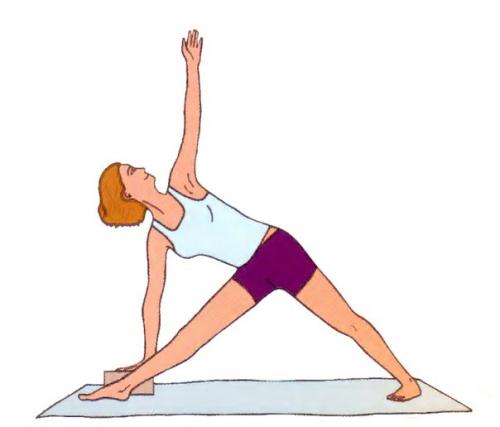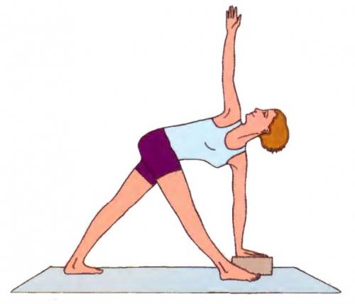 В случае если вы используете кирпич в качестве опоры под руку, поставьте его у внутреннего края стопы. Прижимайте к полу внутренний край правой стопы и внешний край левой. Отводите плечи от головы и на выдохе подавайте вперед левую сторону груди. Вытягивайте правую руку, пытаясь дотянуться до потолка.