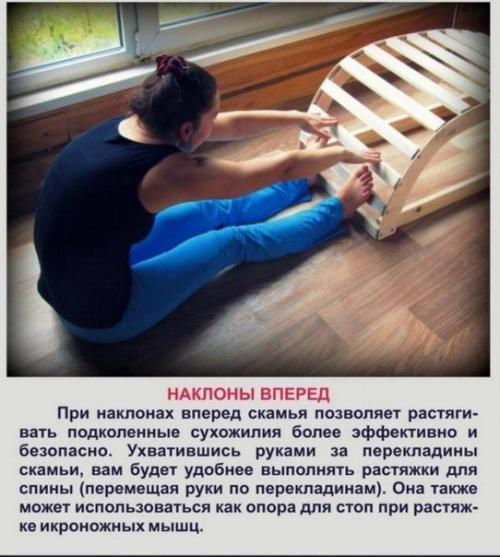 При наклонах вперед скамья позволяет растягивать подколенные сухожилия более эффективно и безопасно. Ухватившись руками за перекладины скамьи, вам будет удобнее выполнять растяжки для спины (перемещая руки по перекладинам. Она также может использоваться как опора для стоп при растяжке икроножных мышц.