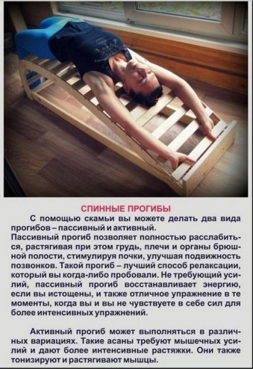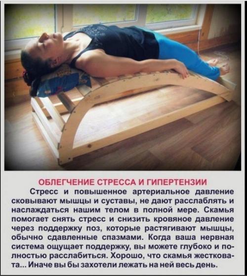 Скамья для прогибовстресс и повышенное артериальное давление сковывают мышцы и суставы, не дают расслаблять и наслаждаться нашим телом в полной мере. Скамья помогает снять стресс и снизить кровяное давление через поддержку поз, которые растягивают мышцы, обычно сдавленные спазмами. Когда ваша нервная система ощущает поддержку, вы можете глубоко и полностью расслабиться. Хорошо, что скамья жестковата. Иначе вы бы захотели лежать на ней весь день.