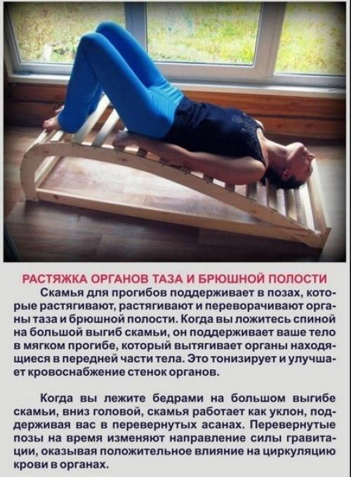 Лавка для прогибов - это уникальная система по своей возможности тонизировать и растягивать органы так же хорошо, как и мышцы. Растягивая, сдавливая, переворачивая, скручивая и массируя, асаны йоги способствует циркуляции крови, которая питает и очищает органы, тонизируя мышцы, выстилающие стенки органов. Лучшее питание, более действенное очищение и регулярное тонизирование способствует оздоровлению органов и их эффективной жизнедеятельности.