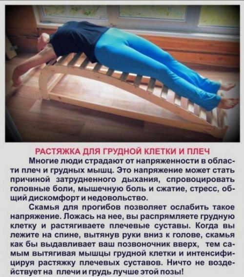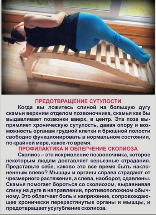 Когда вы ложитесь спиной на большую дугу скамьи верхним отделом позвоночника, скамья как бы выдавливает позвонки вверх, в центр. Эта поза выпрямляет хроническую сутулость, давая опору и возможность органам грудной клетки и брюшной полости свободно функционировать в нормальном состоянии, по крайней мере, какое-то время.