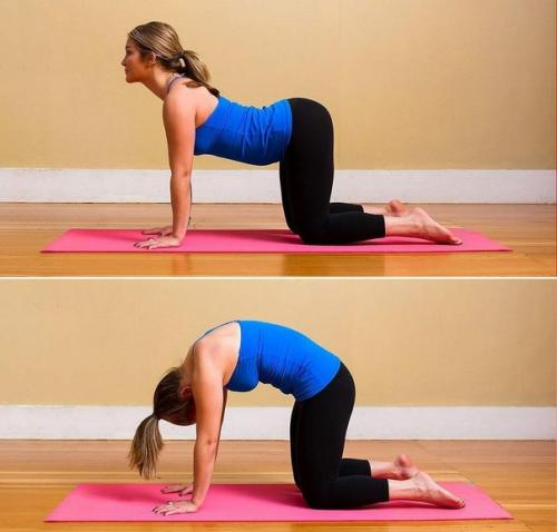 Динамические прогибания и выгибания спины с фиксацией в крайних положениях. Задерживаться дольше в неудобной позе.
