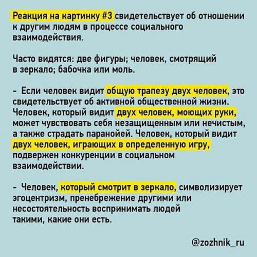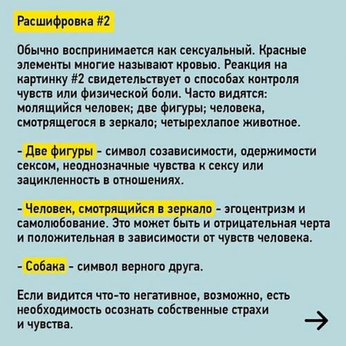 Поэтому приведенные в этом посте расшифровки того, что вы увидели в "Пятнах" теста роршаха - ни в коем случае не руководство к действию или диагноз. Для этого лучше напрямую обращаться к специалистам в области психотерапии.