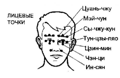 - Воздействие на скулы или виски – нажим тремя пальцами (7 сек.).