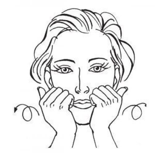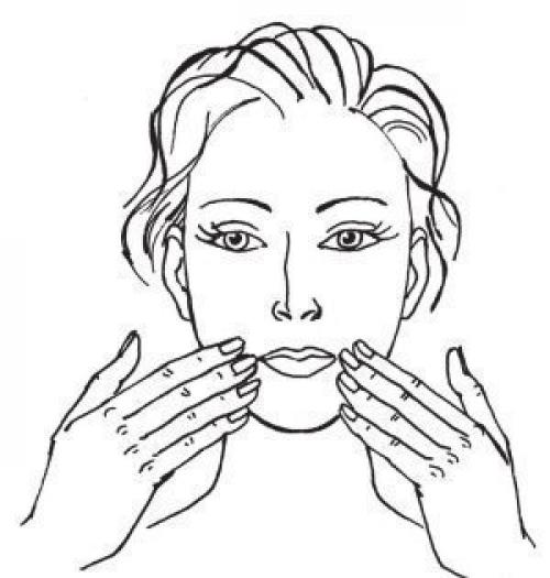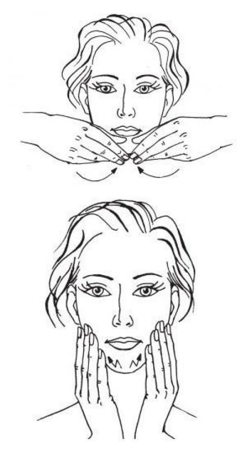 2. давящими поглаживаниями подушечек 4 сомкнутых пальцев помассируйте подбородок от нижнего края к уголкам рта.
