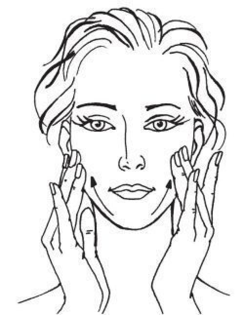 1. внутренними сторонами 4 сомкнутых пальцев выполните давящие поглаживания по направлению от подбородка до середины лба к волосам. Перемещайте руки строго вверх, стараясь не смещать кожу в других направлениях.
