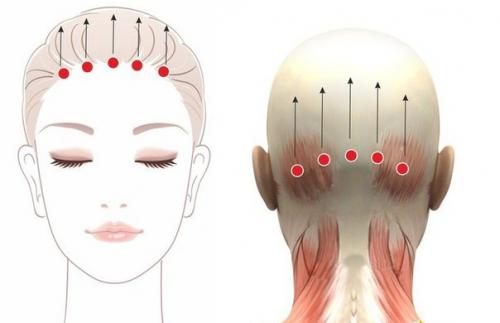 1. легко пульсируйте пальцами в ритме сердца в направлении вверх, к макушке, навстречу друг другу, мысленно посылая мышцам приказ двигаться (направление указано на картинке стрелками. - 30 сек.