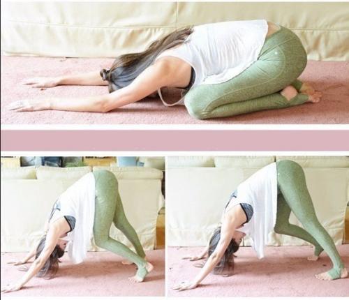Встаем на четвереньки, ноги и руки параллельно. В этом положении начинаем прогибать низ спин, ее среднюю часть и мы заканчиваем движение головой. Тянем живот, грудь, солнечное сплетение вниз, сохраняя медленное глубокое дыхание. Прогиб должен быть такой, будто на спину вам кто-то сел.