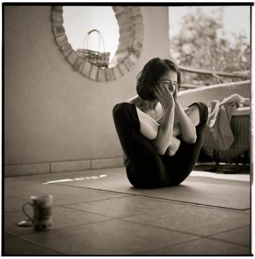 Затем сцепите кисти позади шеи или ухватитесь ими за уши или плечи. Это называется также гарбхасаной, позой эмбриона. В конечной стадии дыхание будет поверхностным, потому что живот и легкие сильно стиснуты. Чтобы выйти из этой позы, сначала отсоедините кисти, затем разогните ноги и полежите плоско в шавасане в течение нескольких минут. Важно, чтобы эта асана выполнялась на одеяле, иначе вы можете повредить выступающие спинные позвонки.