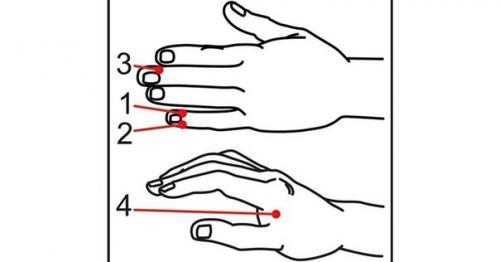 - Третья (симметричная) находится на среднем пальце на 3 мм от угла ногтевого ложа со стороны указательного пальца. Надавливая до легкой болезненности, массировать большим пальцем в течение 2-3 мин.