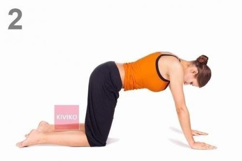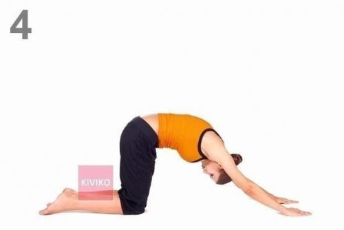 2. гоасана (поза стола) - встать прямо, ноги слегка расставить, руки опущены вдоль туловища. Опуститься на колени, вытянуть руки вперед, наклониться вперед и поставить ладони рук на пол, голова свободно опущена, спина прямая, живот подтянут, внимание сосредоточено на мышцах живота. Зафиксируйте позицию на 1-2 минуты и опуститесь на пятки, отдохните 10-15 секунд и повторите движение еще 1-2 раза.