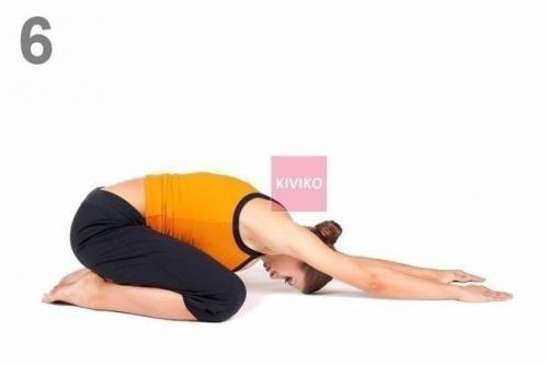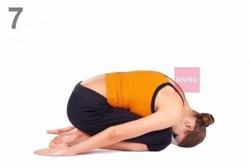 7. баланаса (поза ребёнка) - встать на колени, скрестить ступни ног, руки опустить перед собой. Сесть на голени и пятки ног, поднять руки вверх, расслабить тело, наклониться вперед и опустить голову, коснувшись лбом поверхности пола, расслабить живот, отвести руки назад, дышать ровно и спокойно. Зафиксировать положение на 30-60 секунд, сделать вдох и вернуться в и. п. поменять скрещение ног и выполнить упражнение еще раз.
