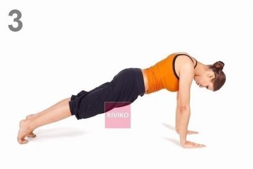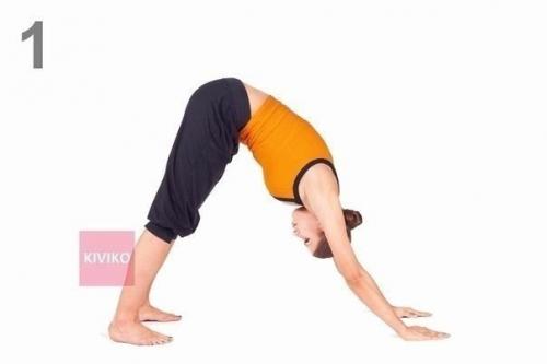 1. адхо мукха шванасана (поза собаки мордой вниз) - лежа на животе, лицо на полу, стопы разведены примерно на 30 см, руки согнуты в локтях, ладони рук лежат на уровне груди. На вдохе поднять тело, опираясь на руки и стопы ног. Выпрямить руки и ноги, вытянуть тело, пятки ног стоят на полу. Зафиксировать позу на 60 секунд, затем опуститься на колени и лечь на пол. Повторить движение 1-2 раза через 10-20 секундный интервал.