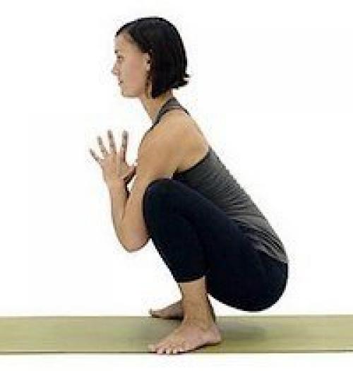 Находясь в наклоне вперед, согните колени, и "Присядьте" с выдохом. Руки держите перед грудью, в знаке приветствия. Сядьте настолько, насколько у вас получится. Посидите так некоторое время, дыша свободно (преимущественно, животом. Это очень полезная поза для поясницы и органов брюшной полости.